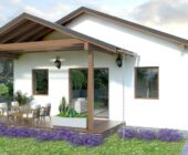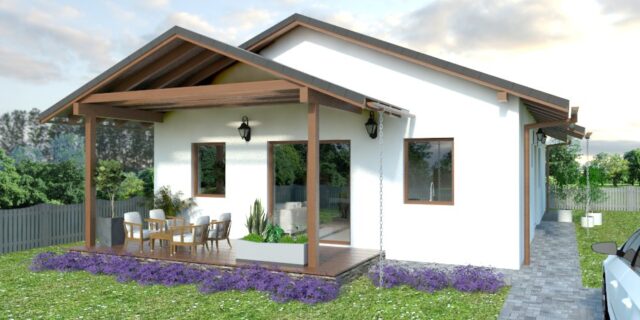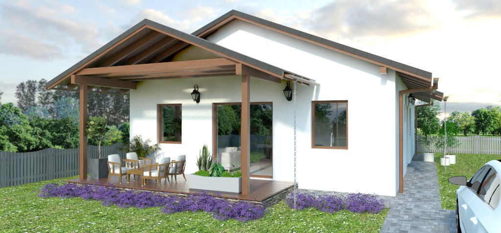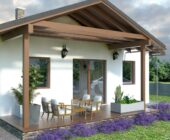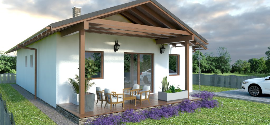 Bungalov 25 by sme pokojne mohli označiť za jemný, elegantný, útulný ba až priam romanticky pôsobiaci. Jednoznačne sa o to postará sedlové prestrešenie terasy. Nielen na exteriér sa dobre pozerá, ale aj na dispozičné rozmiestnenie. Obdĺžnikový pôdorys sme jednoducho rozdelili na dennú a nočnú časť. Do nočnej časti, ktorá obsahuje tri krásne izby, sa zo zádveria, ktoré sa nachádza na širšej strane domu, dostaneme chodbou v strede domu. Oproti zádveriu sa nachádza kúpeľňa a technická miestnosť so zaujímavým výklenkom na práčku a sušičku, umiestnili sme tu aj toaletu. Denná časť domu skladajúca sa z jedálne, obývacej izby a kuchynky dopĺňa špajza, ktorú dokážeme šikovne schovať do kuchynskej linky.