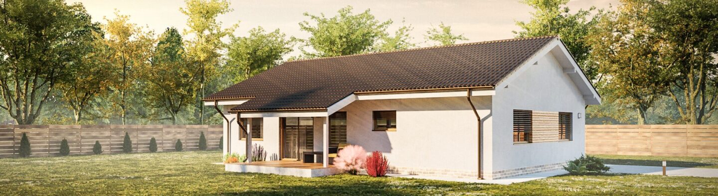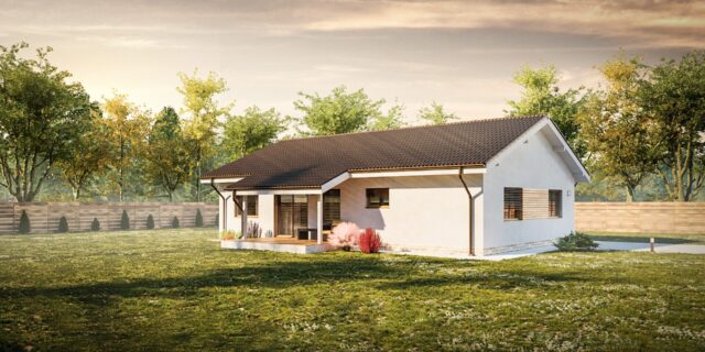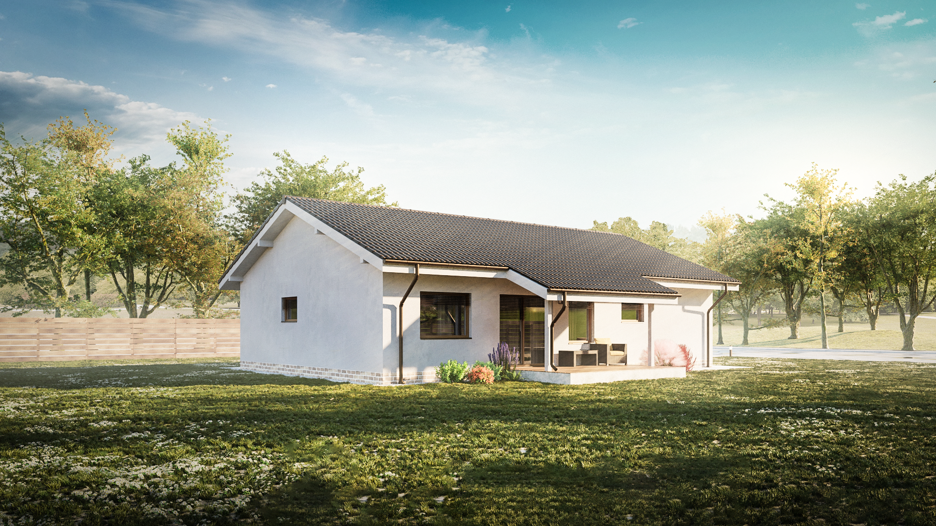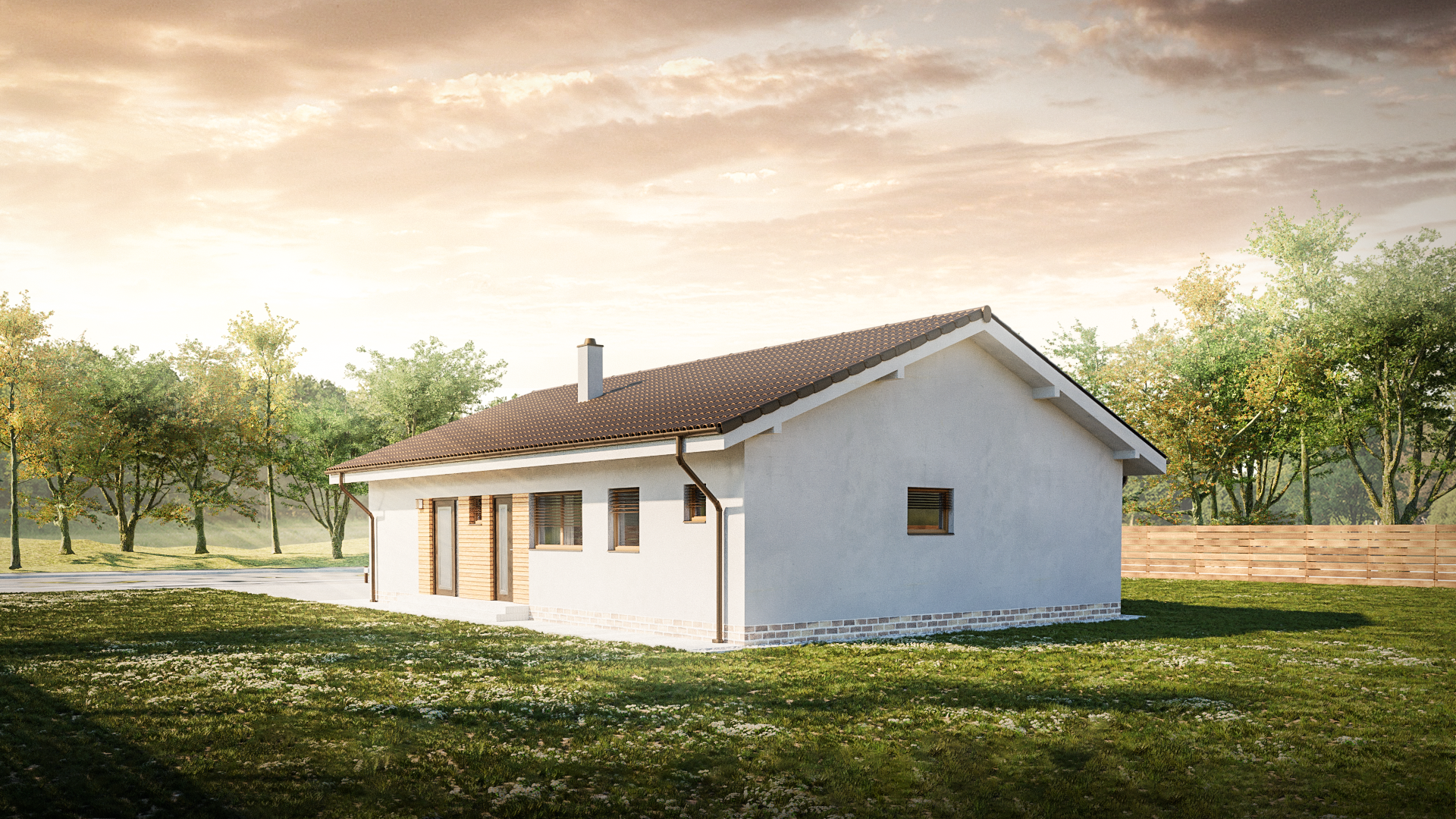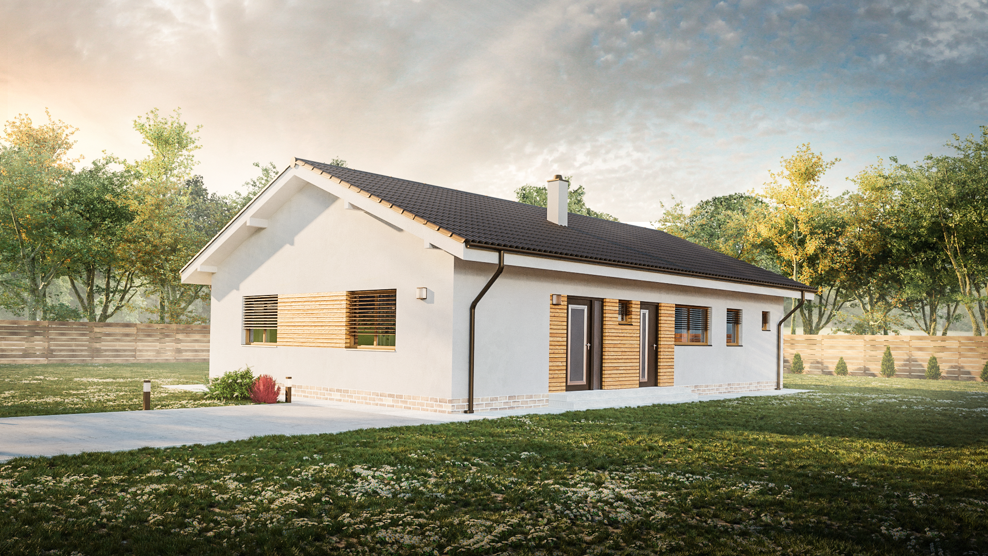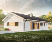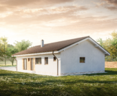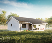 Bungalov 50, ktorý sa dostal do nášho katalógu projektov, poskytne novému majiteľovi komfortné bývanie. Moderný 4-izbový dom ponúka rozsiahlu obývaciu izbu prepojenú s kuchyňou a výstupom na prestrešenú terasu. Plusom je tiež samostatná kúpeľňa v spálni. Ďalšie dve izby môžu slúžiť ako detské izby alebo pracovne. Výhodou je tiež odkladací priestor, ktorý tvorí komora a technická miestnosť priamo pri zádverí. Celkové kladné dispozičné usporiadanie dopĺňa aj menšia chodba oddeľujúca zádverie od obytnej časti domu, ktorá zabráni nežiadúcim únikom tepla.