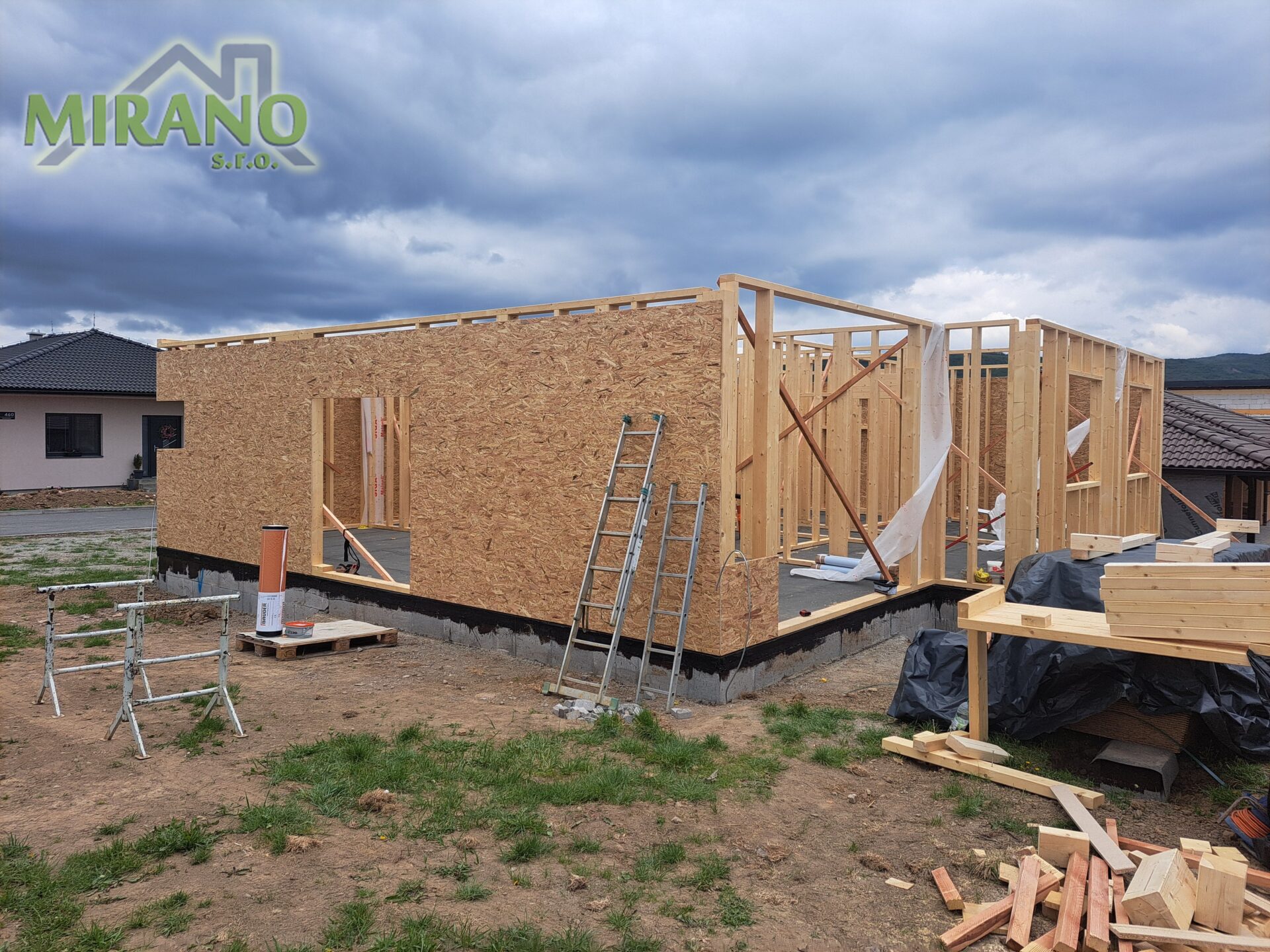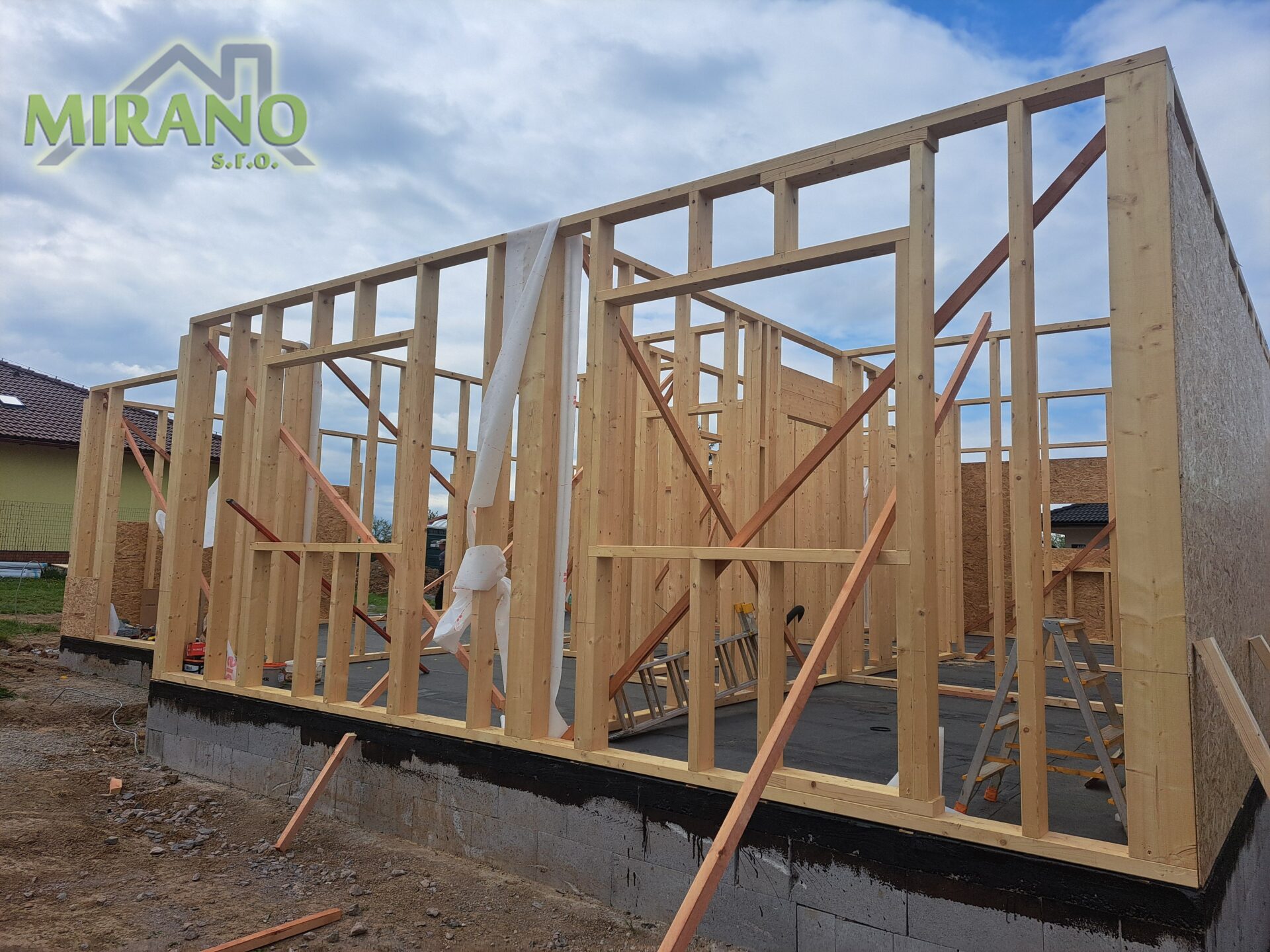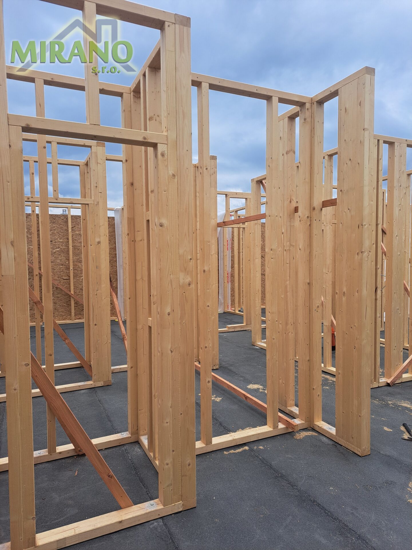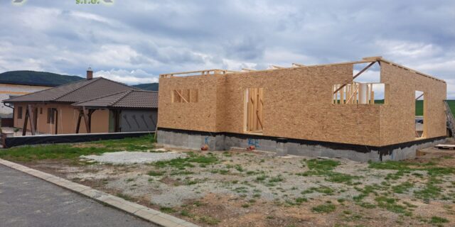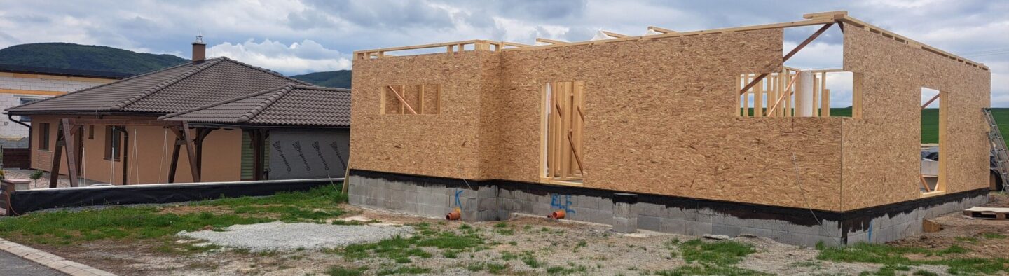 - obvodové steny aj v interiéri a všetky priečky oplášťujeme OSB doskou, ktorá zabezpečí úplnú stabilitu a pevnosť stavby ako pri murovaných domoch